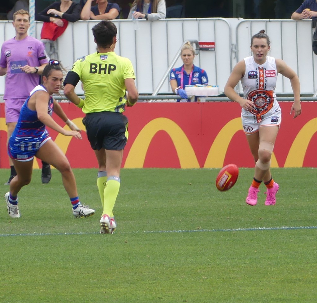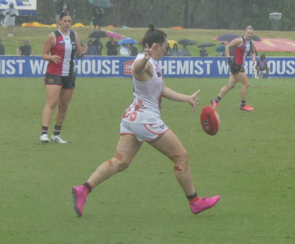 In a Round 1 home game at Blacktown in the rain Parker polled votes in the AFLW league best and fairest for the first time, receiving the maximum three votes for a brilliant performance in which she had a game-high 22 disposals comprised of 17 kicks and five handballs whilst also laying five tackles and taking two marks. Parker’s mentor Eva in her first game as GWS captain had 17 disposals – ranked second for the game and polled two votes in the league best and fairest.