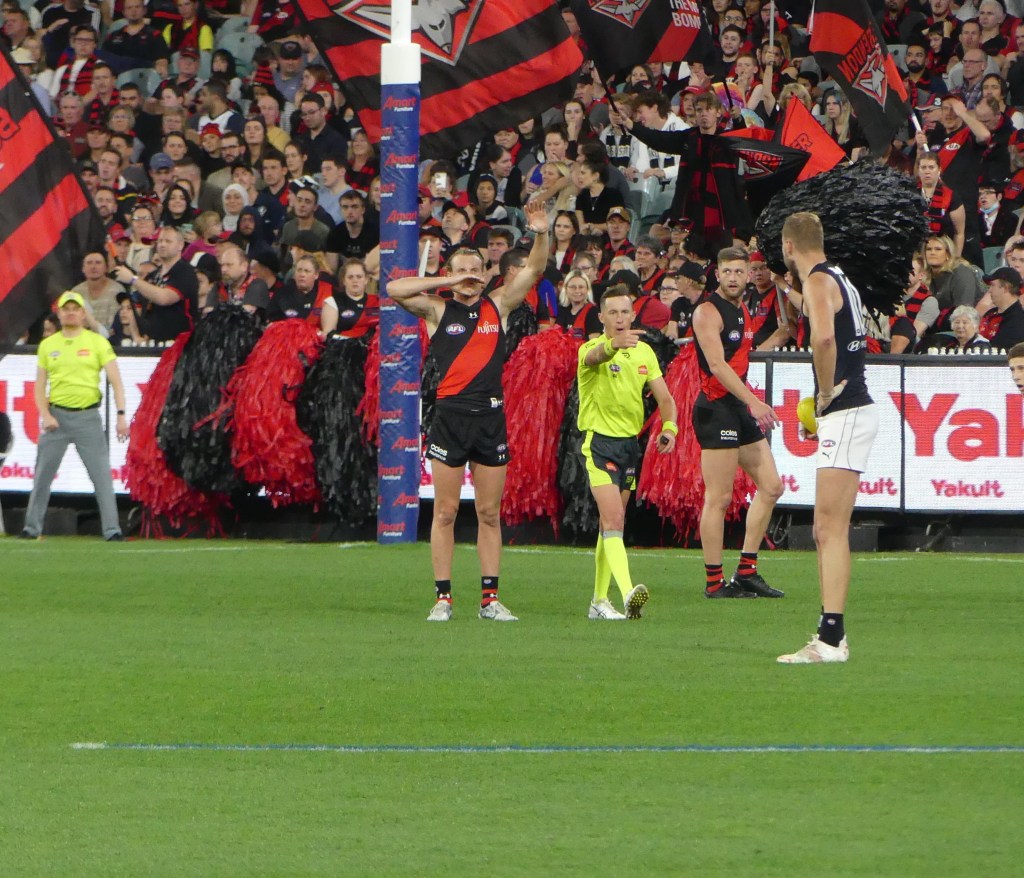 The two photos above are of Harry McKay kicking a left-footed snap goal from a set-shot against Essendon in Round 7 2021 at the MCG on 2 May and the photo below is of McKay celebrating the goal.