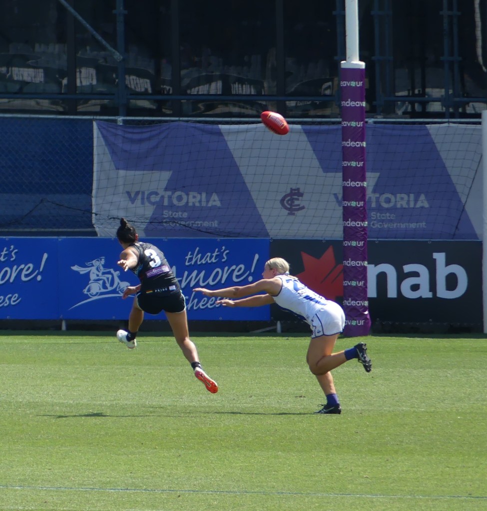 Collingwood scored the opening goal of the inaugural AFLW game at Ikon Park through Jasmine Garner from a set-shot half-way through the first quarter. Two minutes later Vescio registered Carlton’s first ever AFLW goal, receiving a free kick and then converting the set shot from 15 metres out on a slight angle. Late in the first quarter there was a ball-up at the top of Carlton’s goal square, Vescio instructed Carlton ruck Bella Ayre to create some space, Vescio then grabbed the ball out of the ruck contest and kicked their second goal. With three minutes and 45 seconds remaining in the second quarter Vescio received a handball from Ayre, took a bounce and ran in to kick a goal from the goal square to extend Carlton’s lead to 17 points. In the last minute of the third quarter Vescio being pursued by Chloe Molloy was running parallel to the goal-line, picked the ball up, turned right, took half a dozen steps and from 20 metres kicked a left foot snap that dribbled through for a goal.
