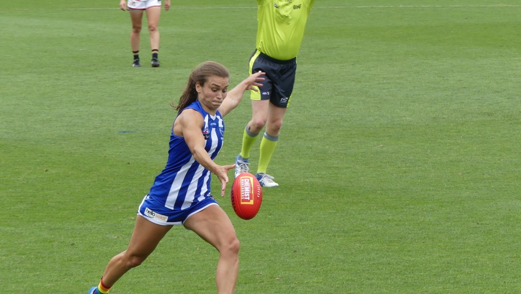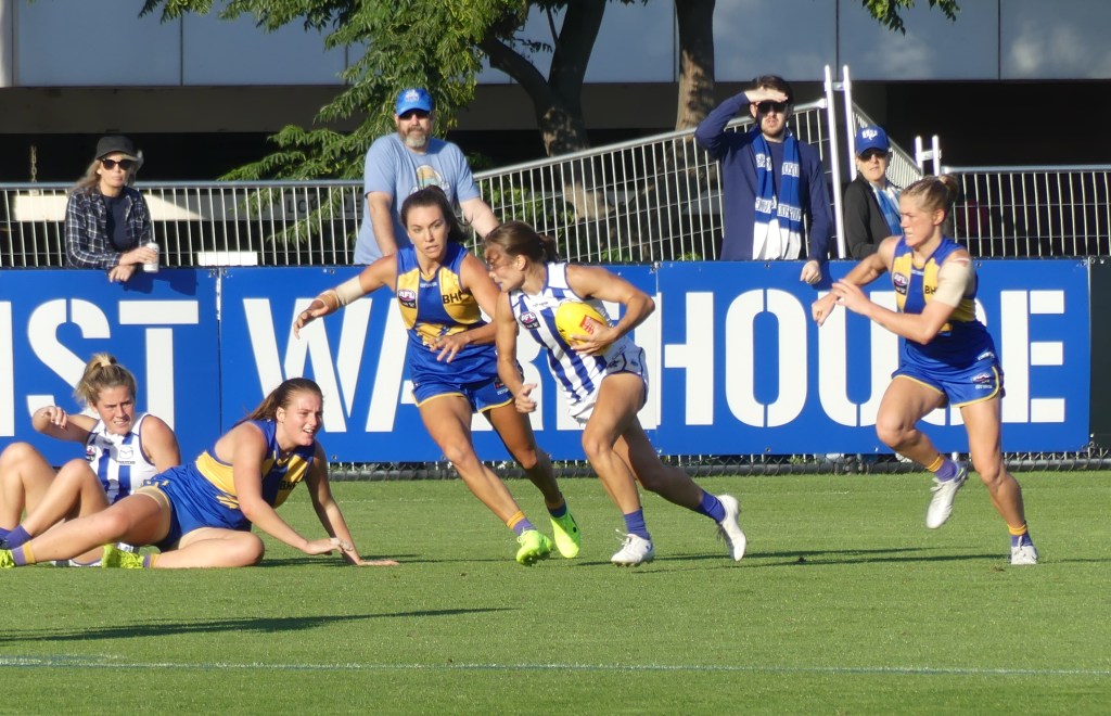 Ashleigh Riddell about to have one of her record breaking 42 disposals for North Melbourne against West Coast at Arden Street in Round 10 on 12 March, 2022