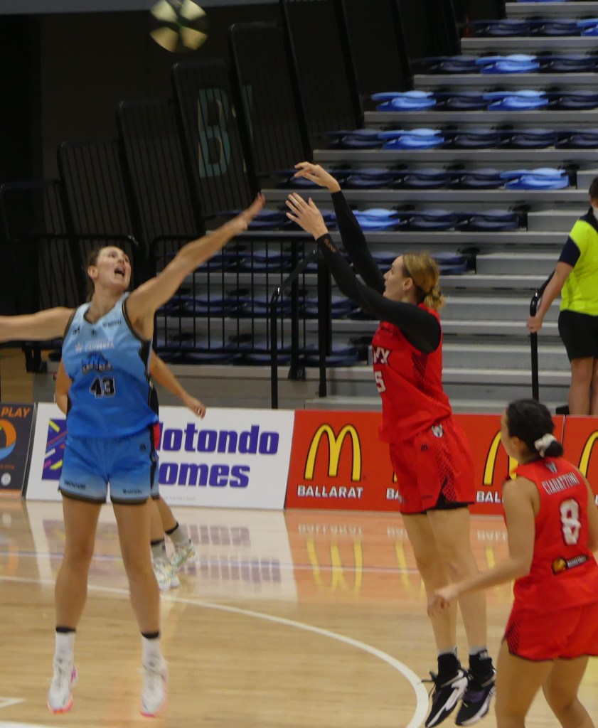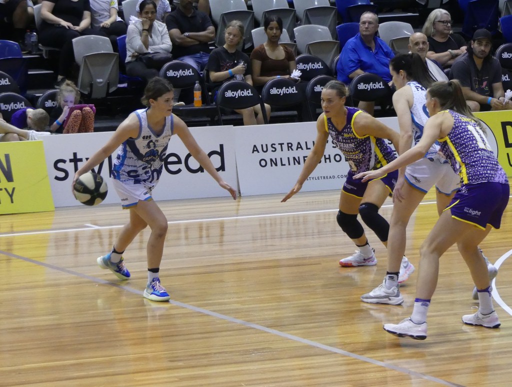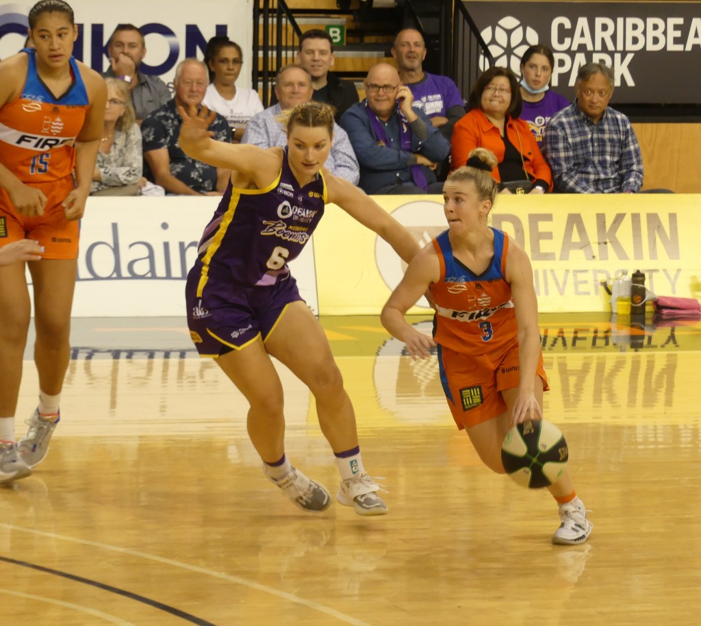 Keely Froling playing for Sydney Uni Flames against Melbourne Boomers at the State Basketball Centre on 25 February 2022, Opals teammate Heal is in the foreground