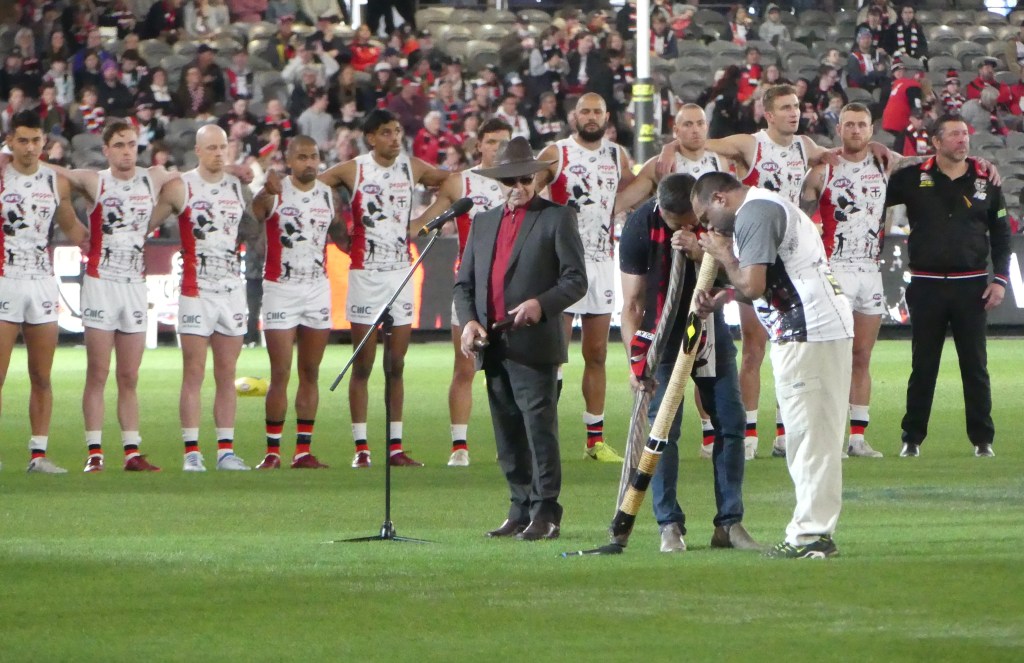 Before St Kilda’s AFL match against North Melbourne at Marvel Stadium in Round 11 at Marvel Stadium Winmar was part of the Welcome to Country, playing the didgeridoo.