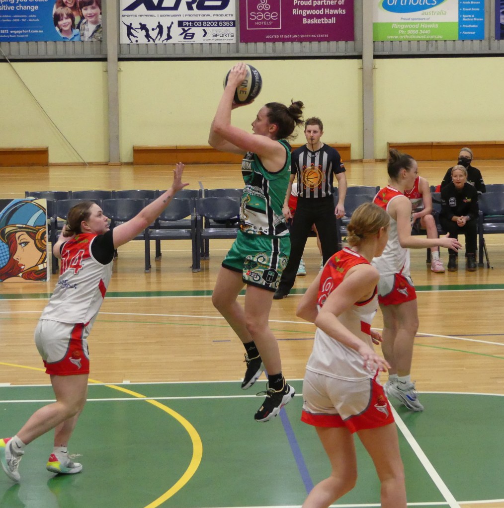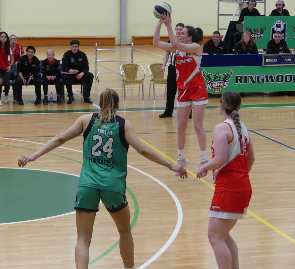 Marena Whittle shooting a jump shot for Ringwood Hawks against Bendigo Braves in the 2022 NBL1 South Grand Final on 3 September 2022 at the State Basketball Centre