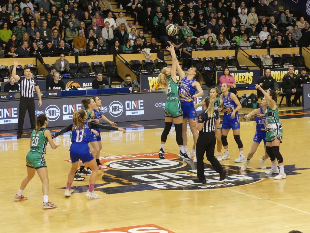 The jump ball for Bendigo Braves against the Ringwood Hawks in the 2022 NBL1 South Grand Final on 3 September 2022 at the State Basketball Centre
