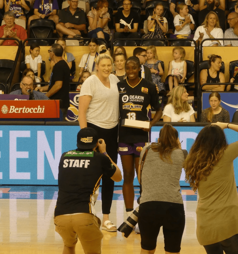Cheryl Chambers with Bec Cole at the pre-game presentation for Cole’s 200th WNBL game against Townsville Fire at Dandenong Stadium on 23 December 2021