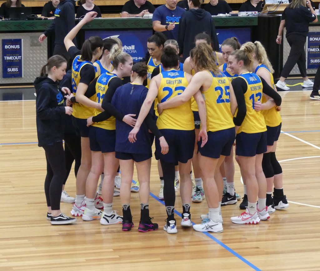 Bendigo Spirit team huddle before their pre-season game against Southside Flyers at Dandenong Stadium on 22 October 2022