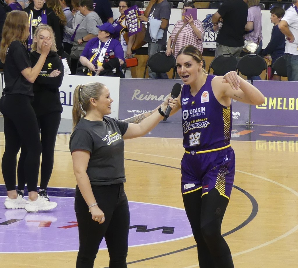 Cayla George getting interviewed after the Melbourne Boomers game against Adelaide Lightning at the State Basketball Centre on 22 December 2022