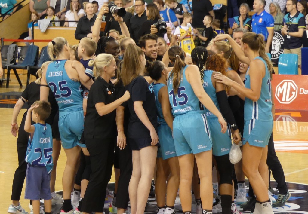 Southside Flyers huddle with team and staff members as well as some family after defeating Bendigo Spirit at at the State Basketball Centre on 6 January 2023