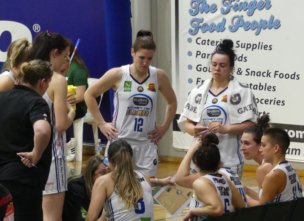 Sydney Uni Flames players and Head Coach Cheryl Chambers during a time-out against Dandenong Rangers on 19 October 2018 at Dandenong Stadium