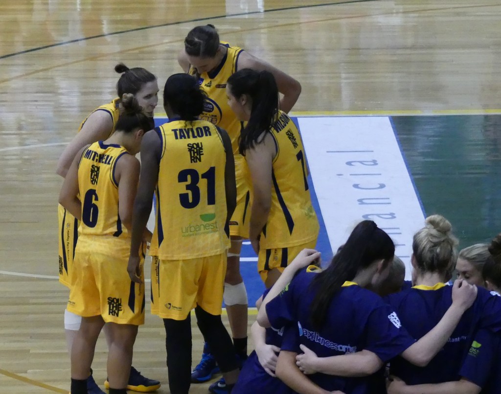 Ally Wilson in an on-court huddle with Sydney Uni Flames teammates during the game against the Melbourne Boomers at the State Basketball Centre on 26 November 2017