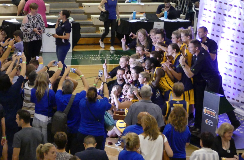 Sydney Uni Flames team and staff members with the WNBL Championship trophy after winning game 2 of the 2016/17 Grand Final series against Dandenong Rangers on 17 March 2017 at Dandenong Stadium