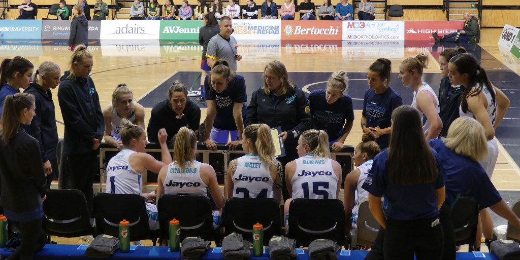 Steph Reid with Southside Flyers teammates and Head Coach Cheryl Chambers in a timeout during pre-season game against Melbourne Boomers at the State Basketball Centre on 5 October 2019
