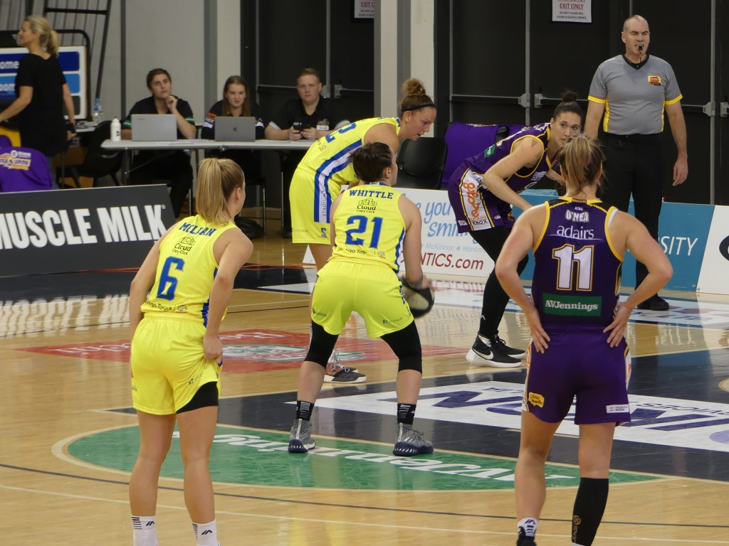 Lauren Mansfield and Marena Whittle playing for Adelaide Lightning against the Melbourne Boomers at the State Basketball Centre on 22 December 2022
