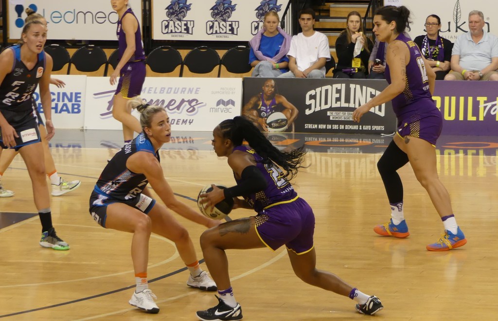 Ally Wilson playing defense for Bendigo Spirit against Southside Flyers guard Bec Cole at the State Basketball Centre on 6 January 2023