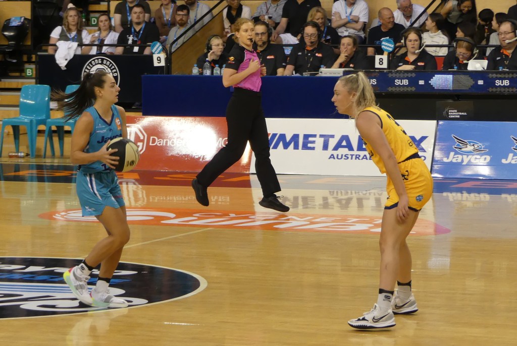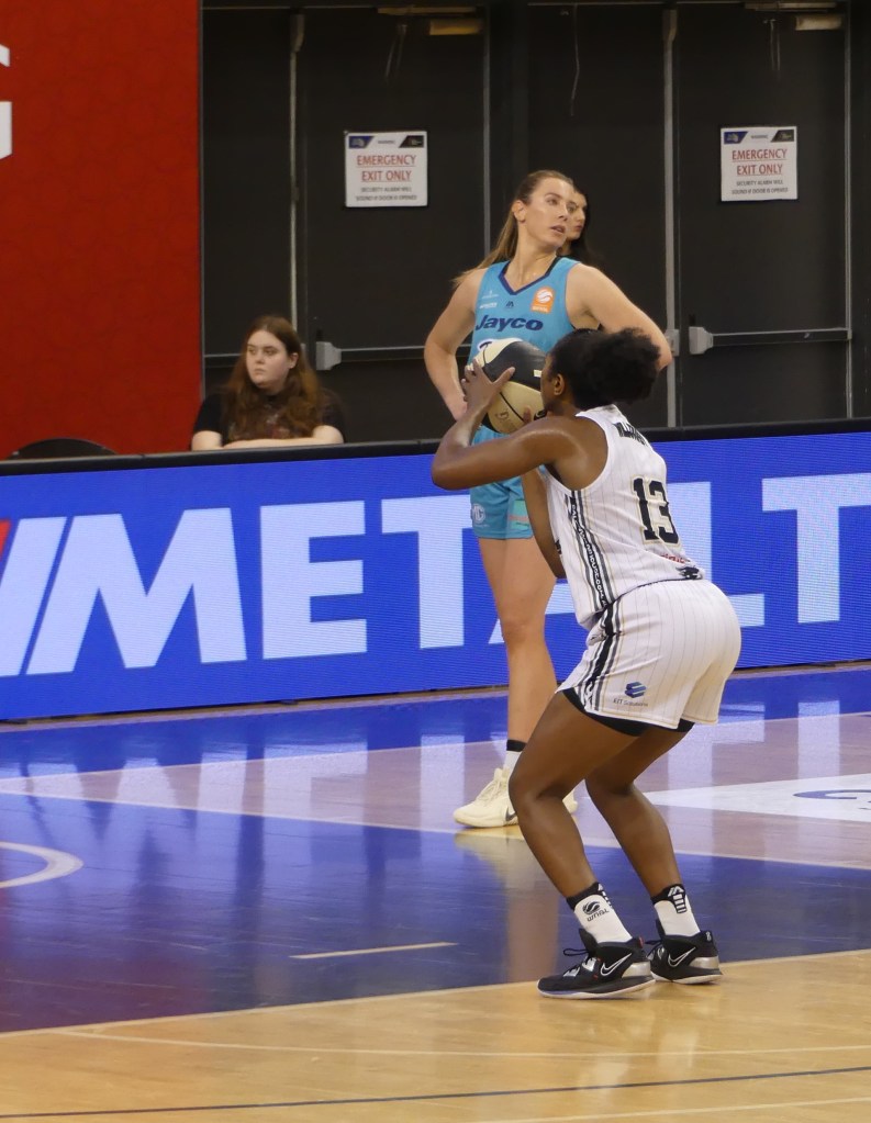 Rebecca Pizzey playing defense for UC Capitals against Southside Flyers at the State Basketball Centre on 28 December 2022
