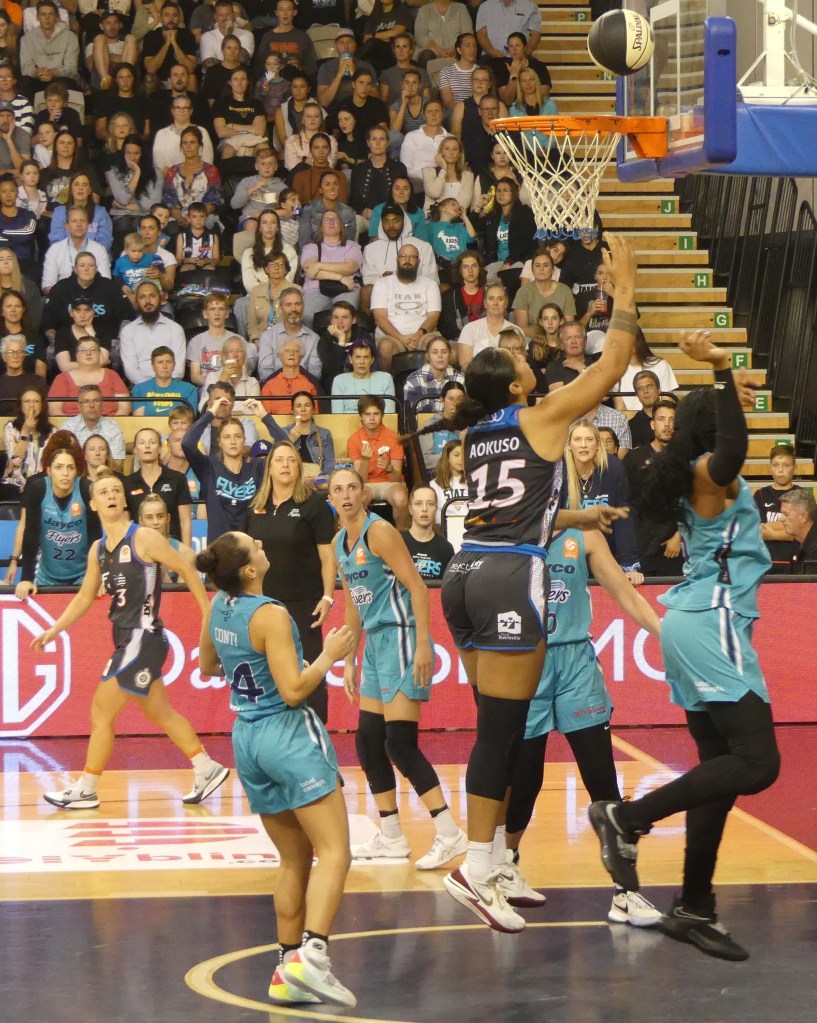 Zitina Aokuso taking a rebound Townsville Fire against Dandenong Rangers at Dandenong Stadium on 13 January 2019