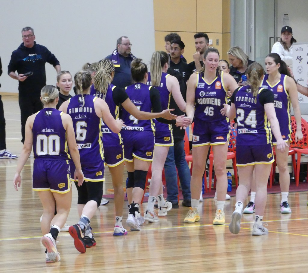 Perth Lynx players after winning in overtime against the Melbourne Boomers at Gippsland Regional Indoor Sports Stadium (GRISS), Traralgon on 6 February 2022. Mackenzie Clinch Hoycard (top, second from right) and Alexandra Ciabattoni (bottom right) are the only players from this photo that are playing for Perth in 2023/24. Two members of Perth’s 2021/22 main roster – Darcee Garbin and Sami Whitcomb aren’t in this photo as they were on Australian Opals duties.