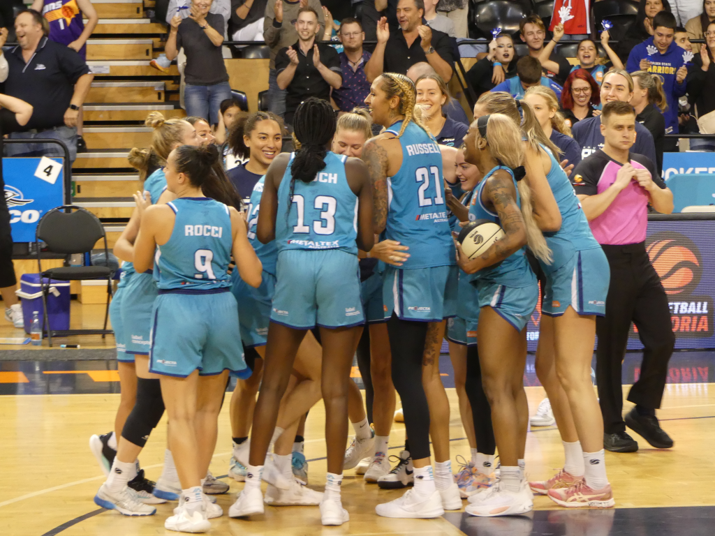 Southside Flyers celebrating following their two point victory against Perth Lynx at the State Basketball Centre on 22 November 2023