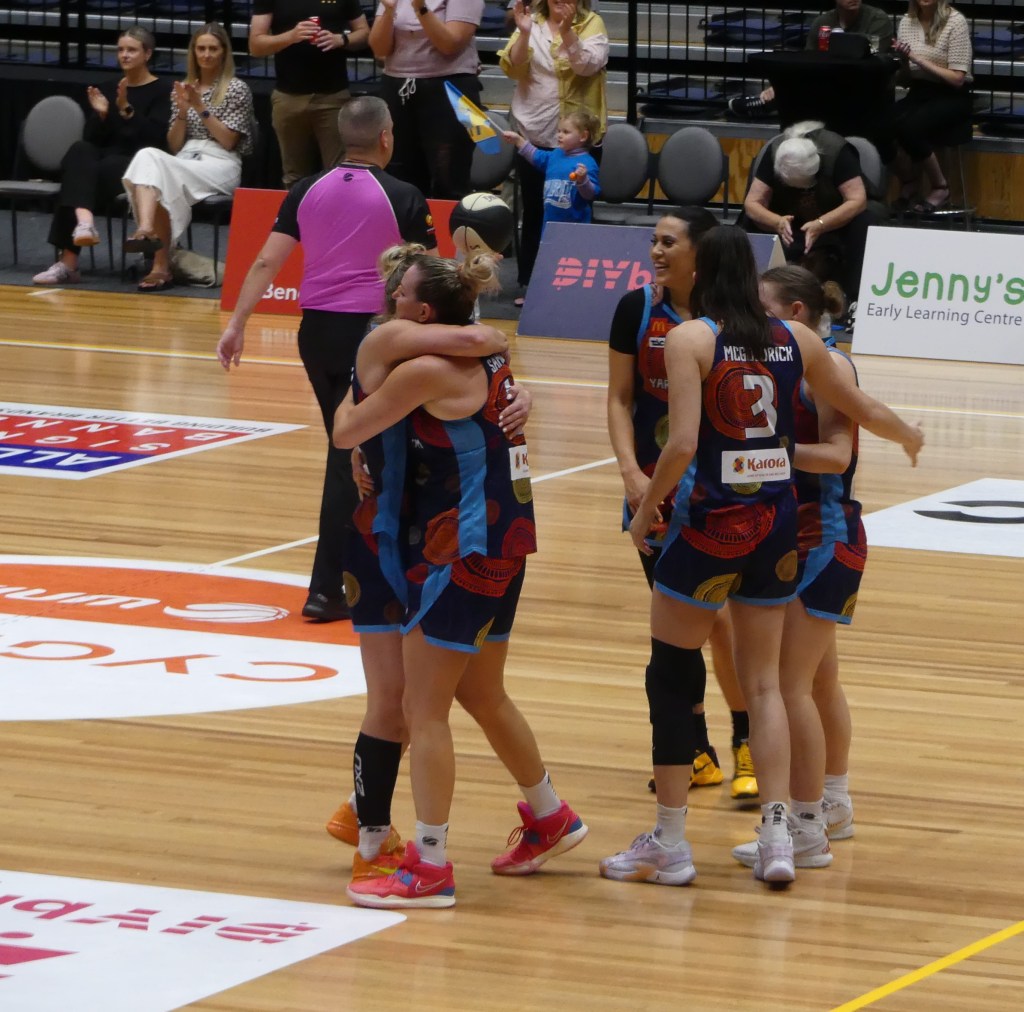 Bendigo Spirit players celebrating after defeating Sydney Flames on 25 November 2023 at Red Energy Arena