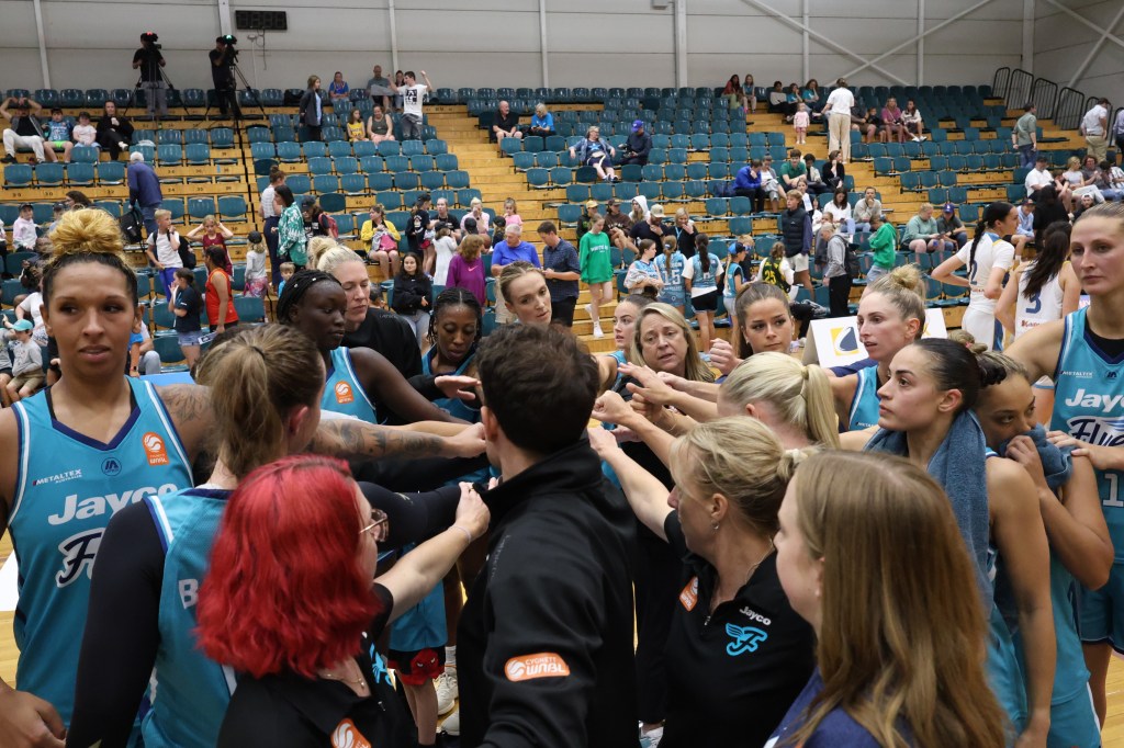 Southside Flyers team huddle after their victory against Bendigo Spirit at the Melbourne Sports and Aquatic Centre on 17 January 2024