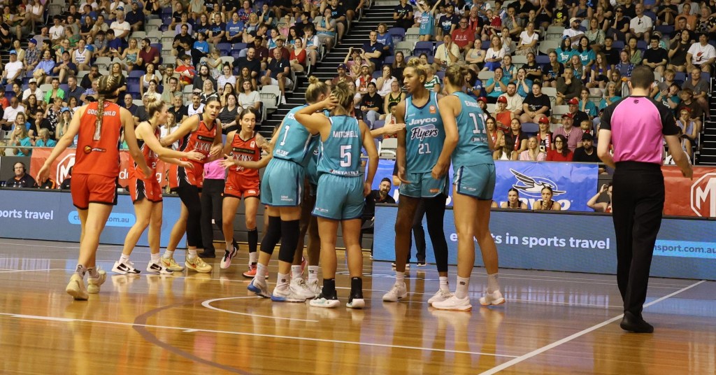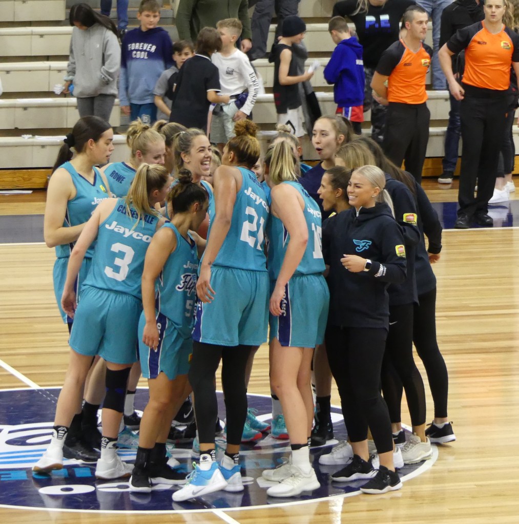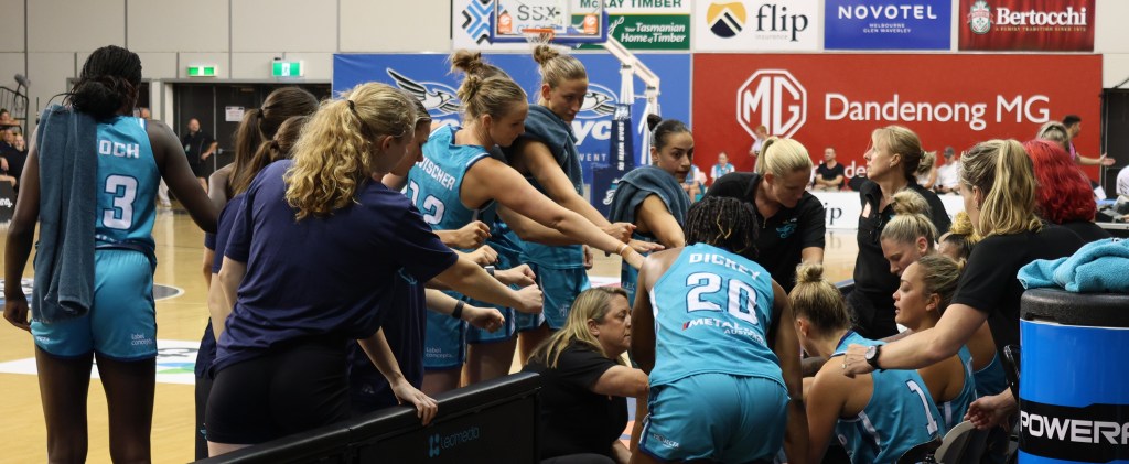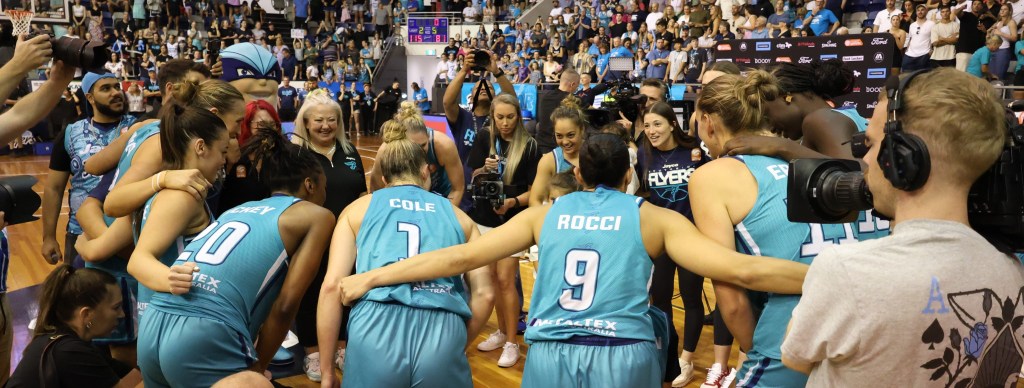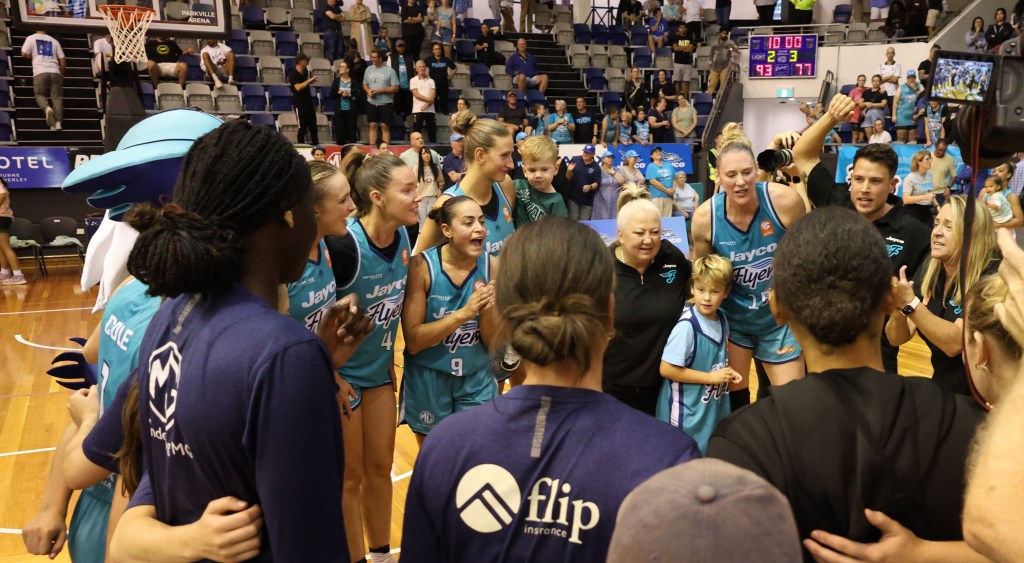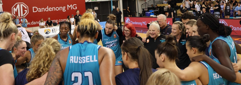 Southside Flyers in a team huddle after they defeated Perth Lynx in game 3 of the 2023/24 Grand Final at Melbourne Sports Centres – Parkville on 17 March 2024
