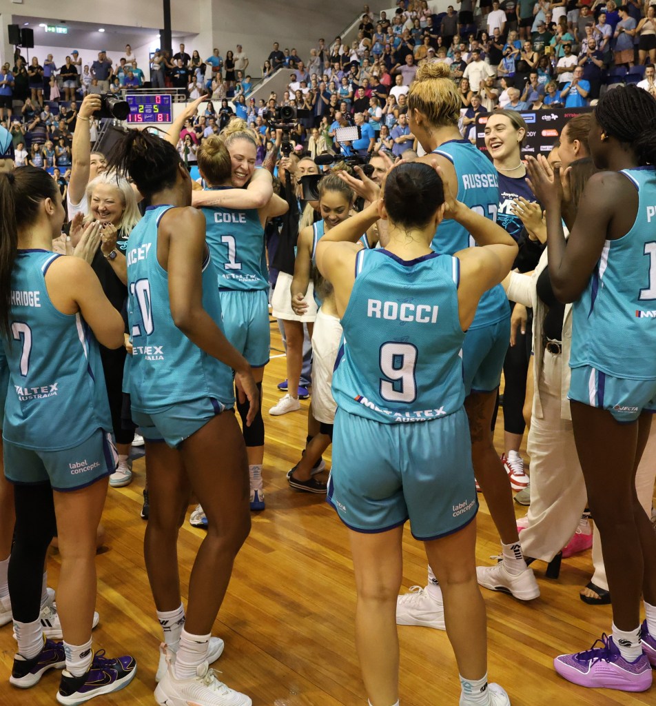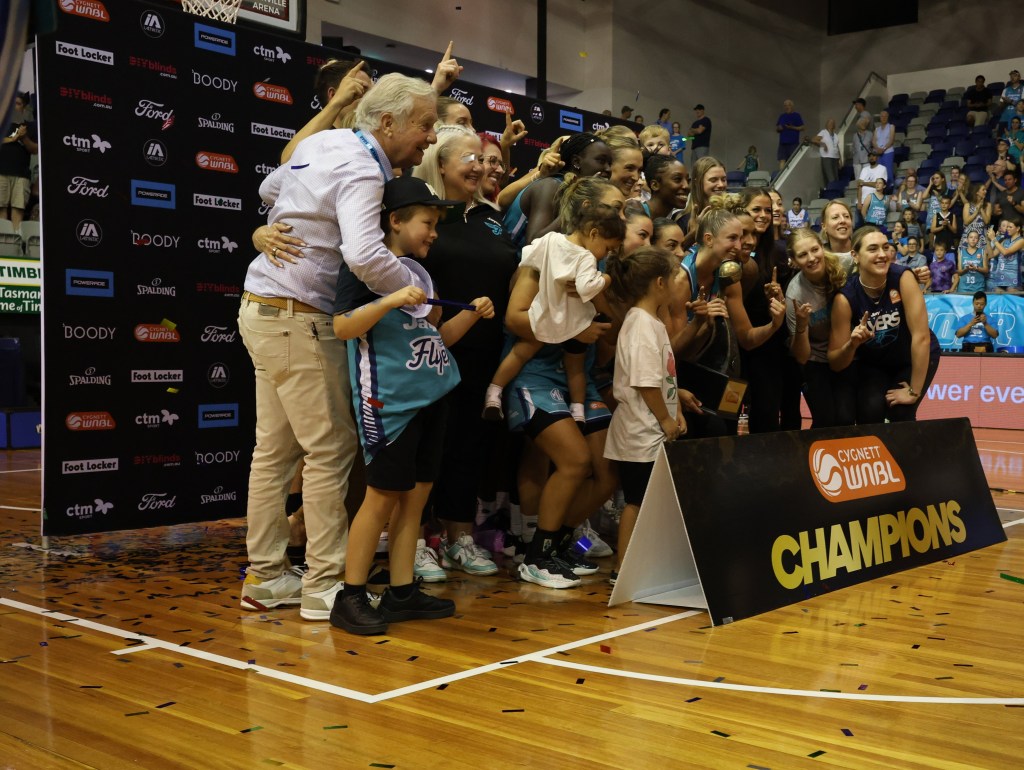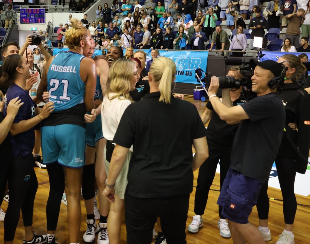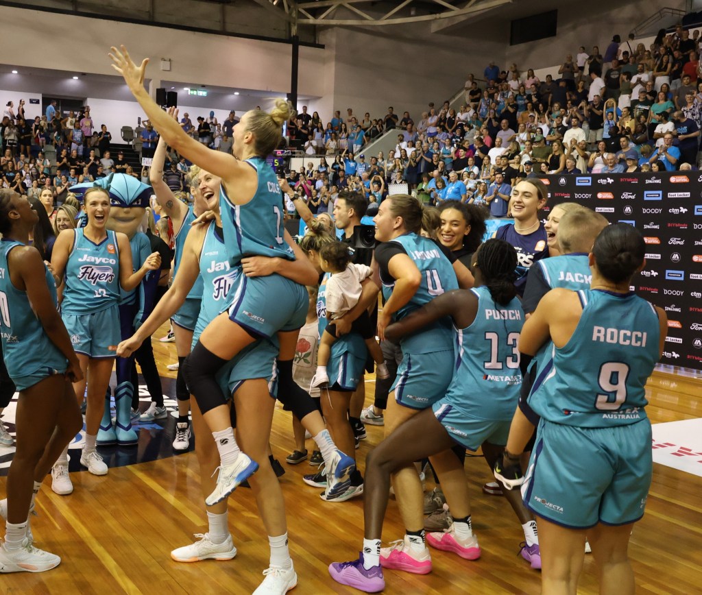 Below – Southside Flyers celebrating winning game 3 of the Grand Final against Perth Lynx at Melbourne Sports Centres – Parkville on 17 March 2024 to win the WNBL Championship