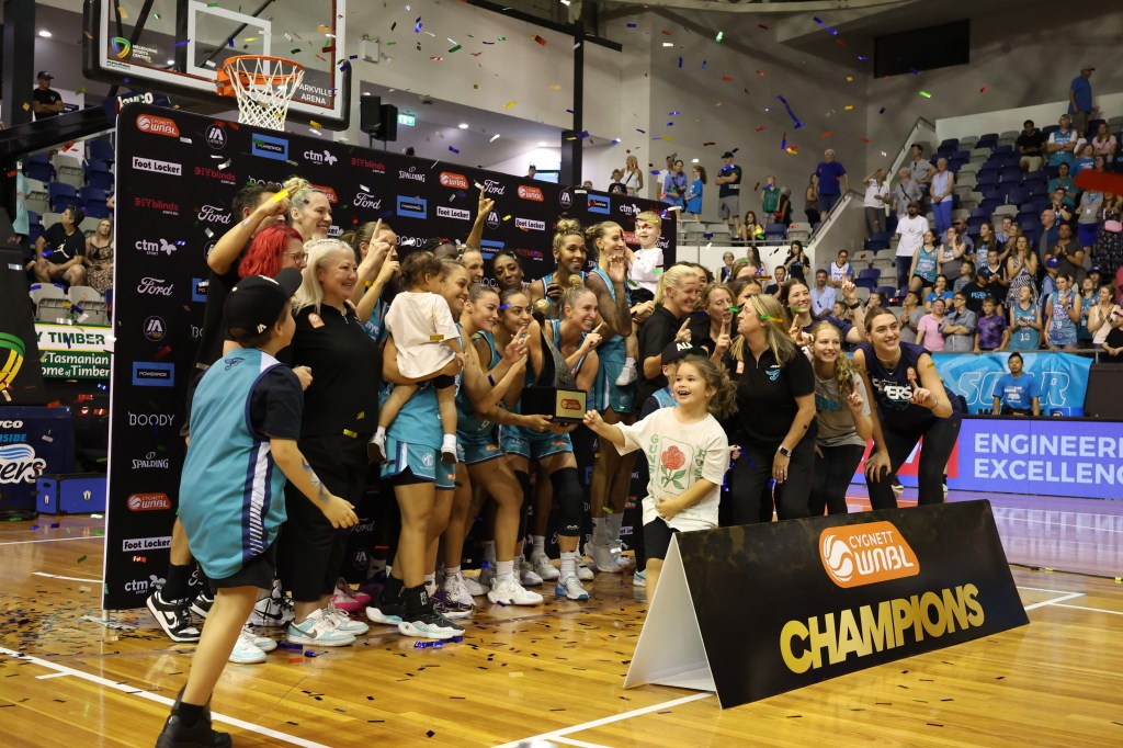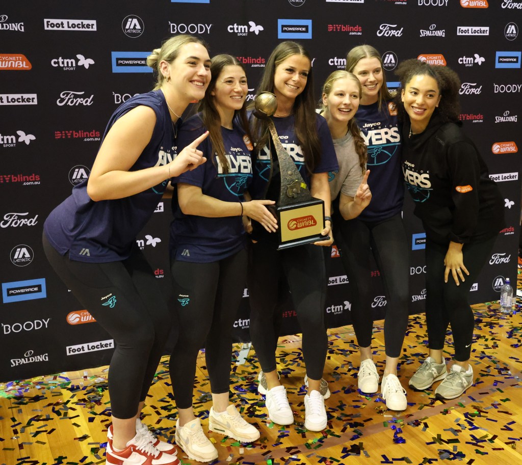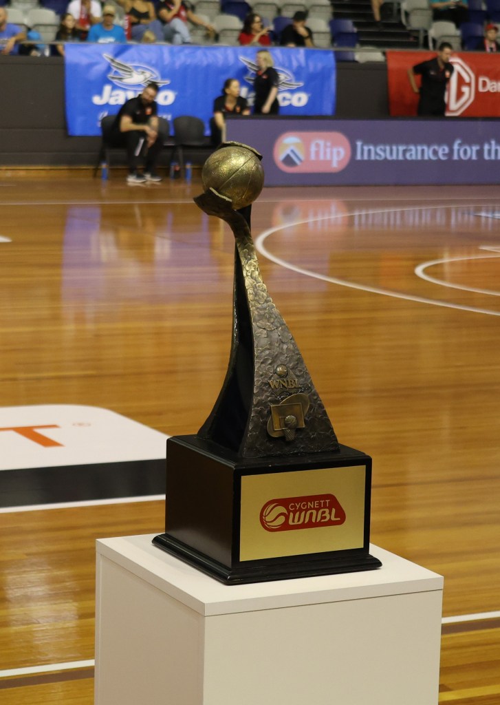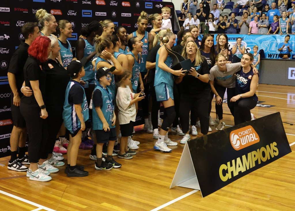 Above – Southside Flyers with the WNBL Championship trophy at Melbourne Sports Centres – Parkville on 17 March 2024