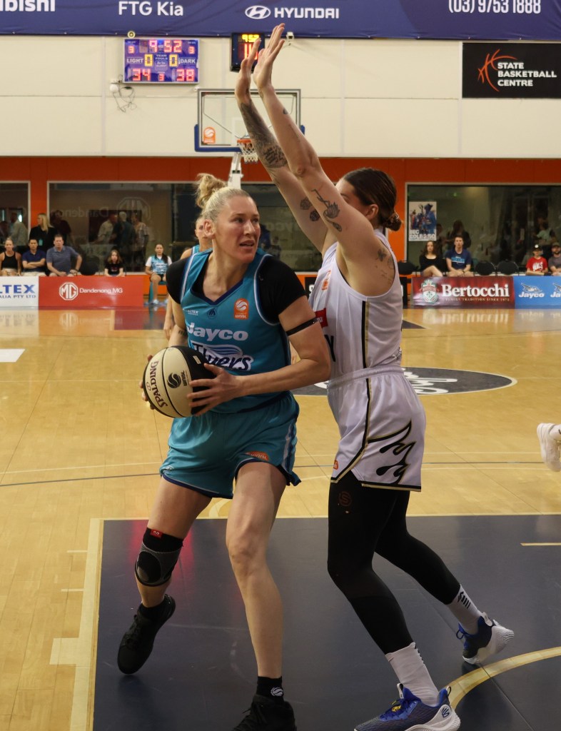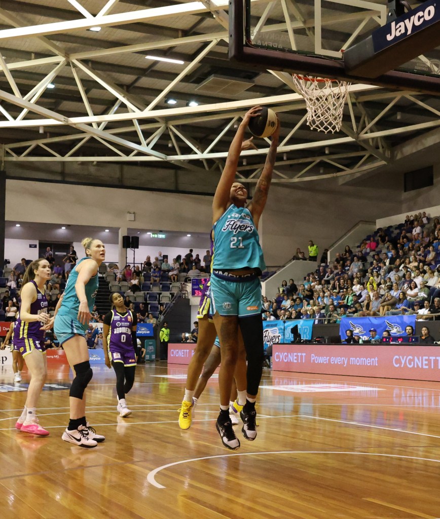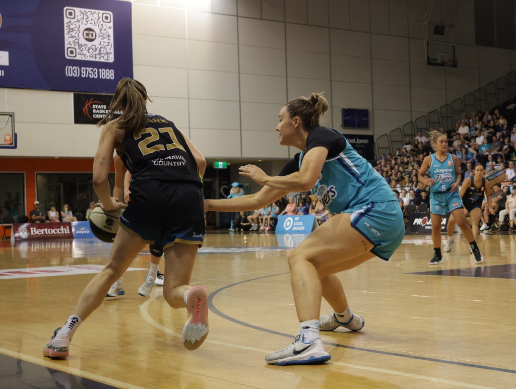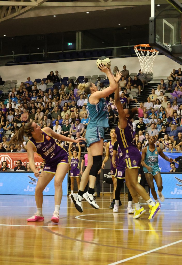 Above – Jasmine Dickey taking a defensive rebound for Southside Flyers in game 3 of the Grand Final against Perth Lynx at Melbourne Sports Centres – Parkville on 17 March 2024