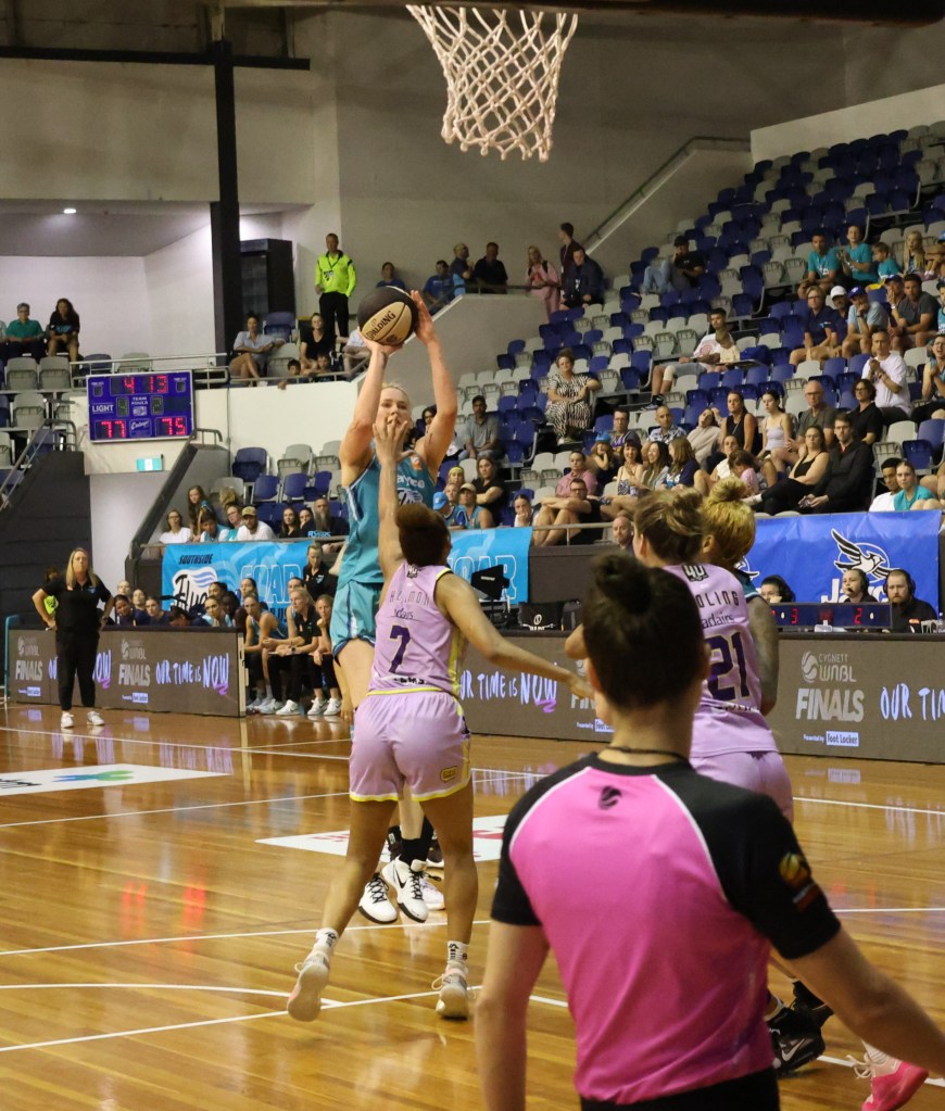 Mercedes Russell about to make a jump shot for Southside Flyers in game 1 of the Grand Final against Perth Lynx at Melbourne Sports Centres – Parkville on 10 March 2024