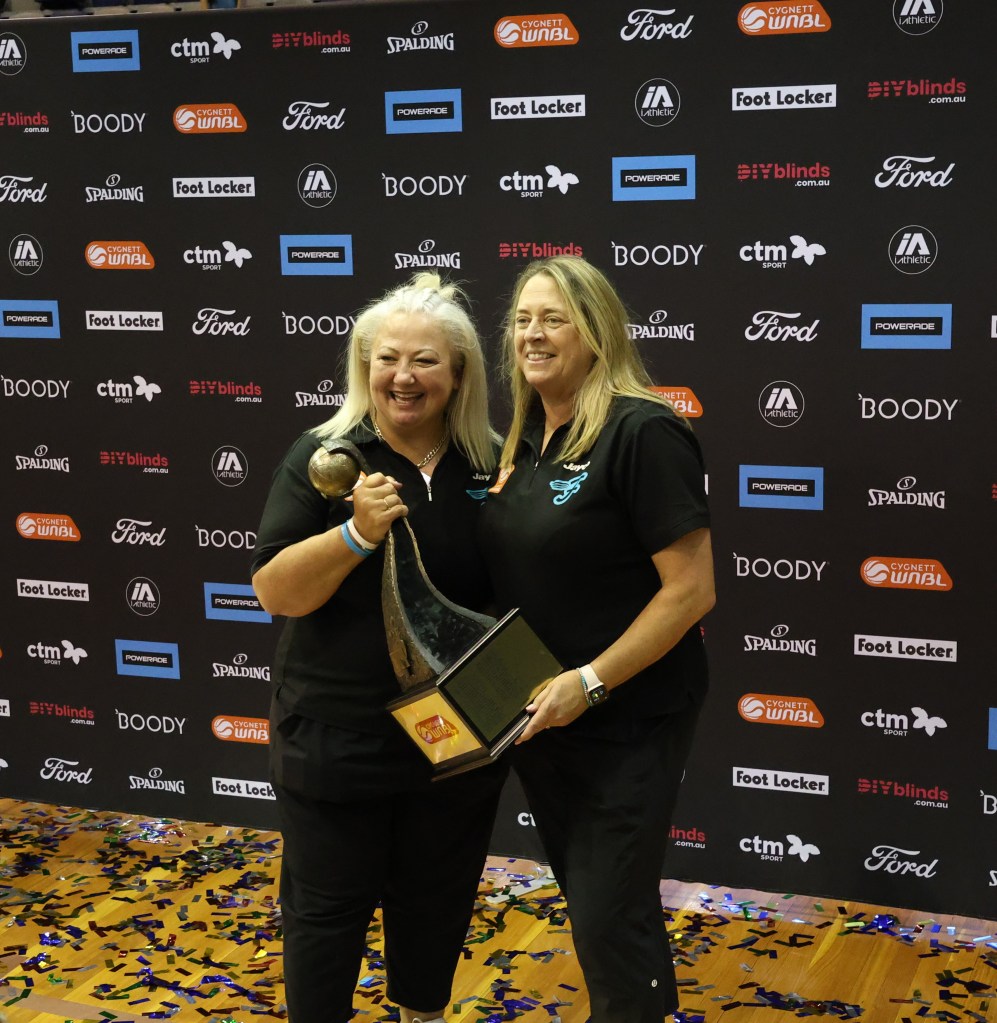 Above – Southside Head Coach Cheryl Chambers and captain Bec Cole holding the WNBL Championship trophy at Melbourne Sports Centres – Parkville on 17 March 2024