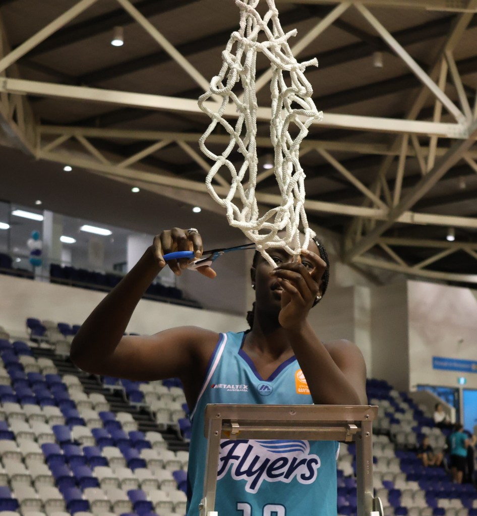 Above – Nyadiew Puoch cutting the net at Melbourne Sports Centres – Parkville on 17 March 2024