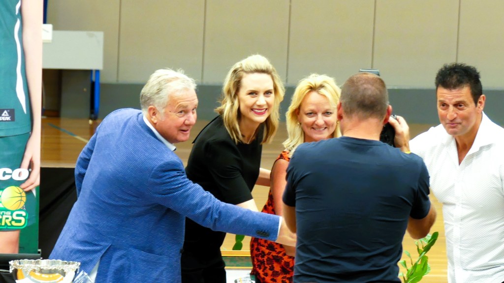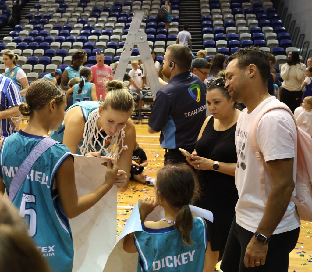 After the speeches had concluded Southside Head Coach Chambers and captain Cole were presented with the WNBL Championship trophy. It was the second time in four seasons that Southside had won the WNBL title, having taken out the Championship during the 2020 hub season in North Queensland. With the 2023/24 WNBL title having been won in Melbourne Southside players, coaches and staff had more family, friends, sponsors and Flyers fans to celebrate the title win with than in 2020. As is customary in basketball as part of the Championship celebrations Southside players, coaches and staff took turns cutting the net.