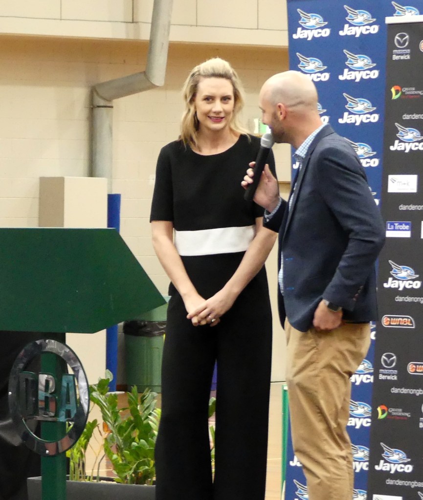 Sally Phillips being interviewed by Nathan Strempel at the Jayco Rangers 25th anniversary celebrations at Dandenong Stadium on 14 January 2017