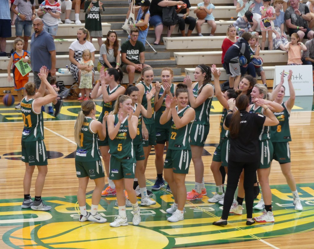 Below – Jayco Rangers post-game after defeating Perth Lynx in game 3 of the semi final at Dandenong Stadium on 5 March 2017