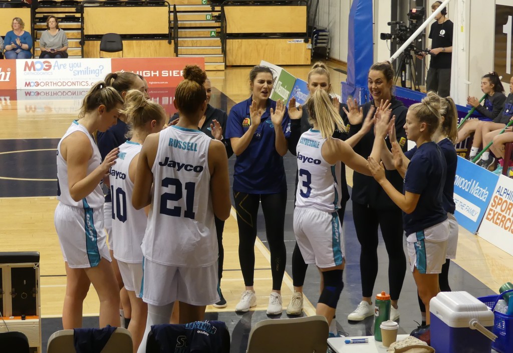 Southside Flyers in a team huddle after the victory against Townsville Fire on 12 October 2019 at Dandenong Stadium