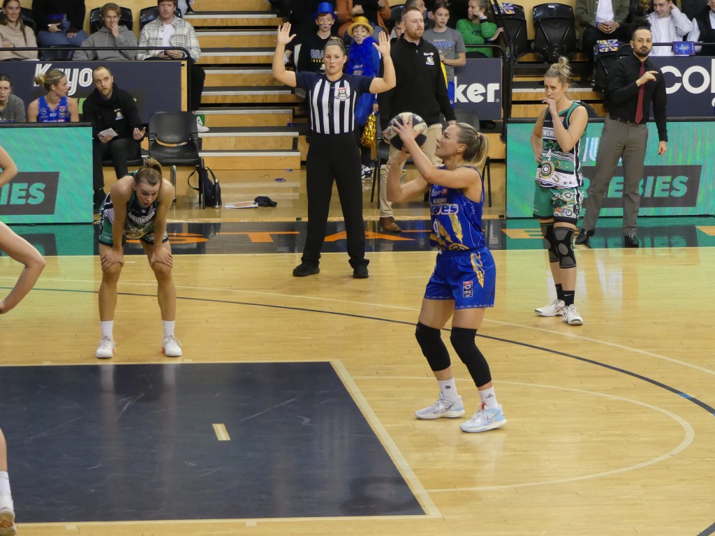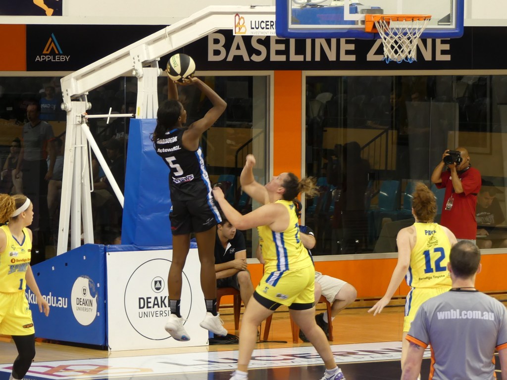 Sami Whitcomb shooting a three-pointer for Townsville Fire against Bendigo Spirit in a WNBL game at Geelong Arena on 7 January 2024