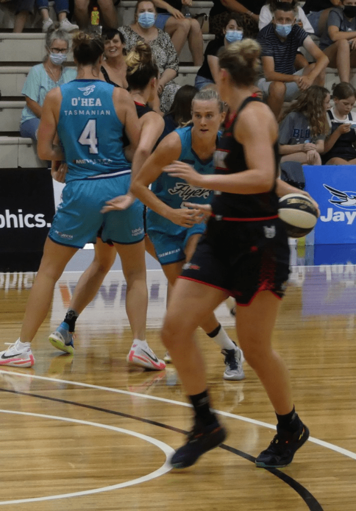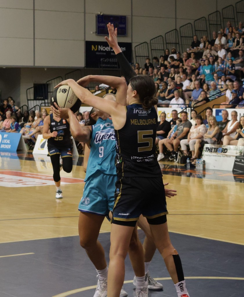 Below: Kristy Wallace playing for Melbourne Boomers against JCU Townsville Fire at the State Basketball Centre on 7 December 2022