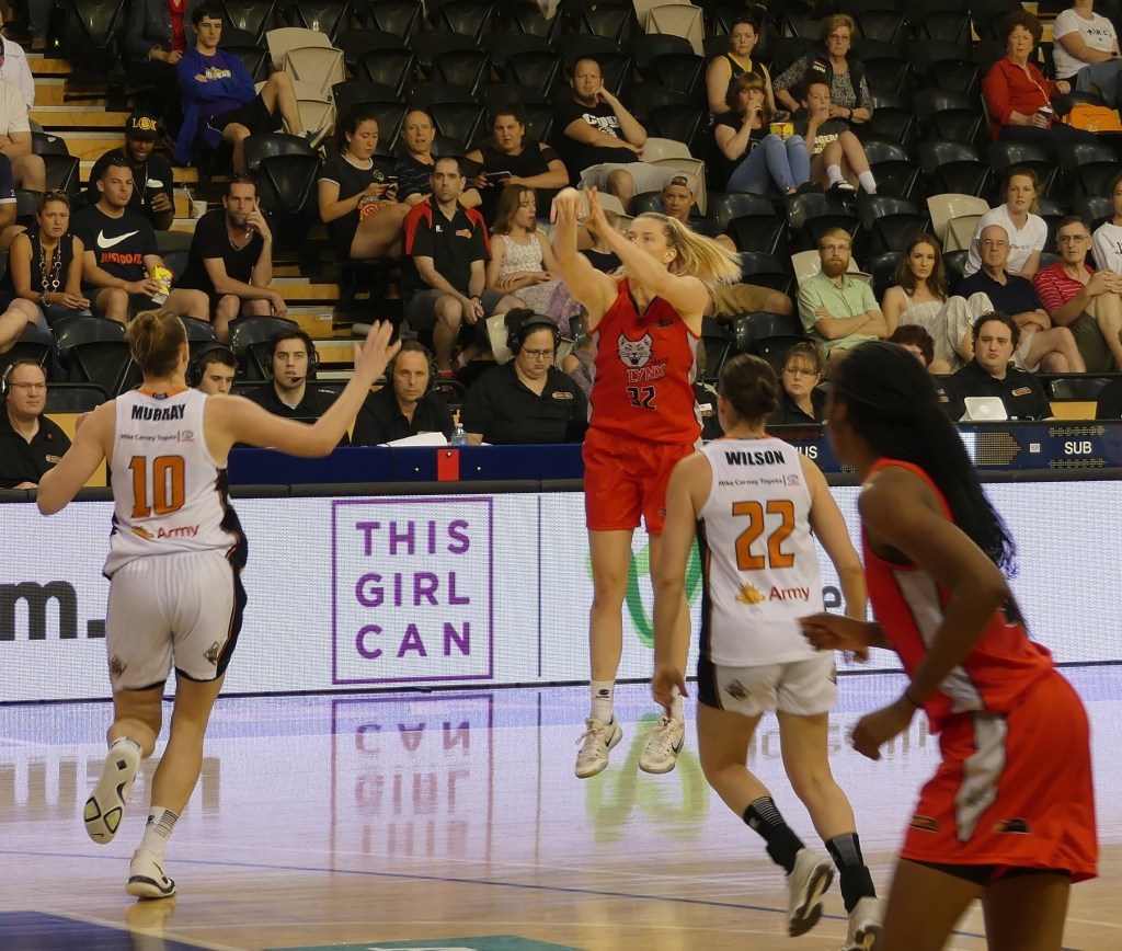 Sami Whitcomb shooting a three-pointer for Perth Lynx against Townsville Fire at the State Basketball Centre on 26 November 2017