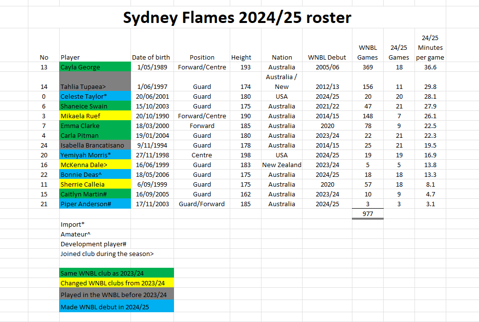 In 2023/24 Sydney with a new look roster and Guy Molloy in his first season as Head Coach of the club fell one win short of making the playoffs. In the off-season the Flames signed five of the seven players that averaged more than 16.5 minutes per game in 2023/24 and the club was on track to have greater continuity with their roster in 2024/25. The players in this category were Lauren Nicholson, Cayla George, DiDi Richards, Shaneice Swain and Emma Clarke.