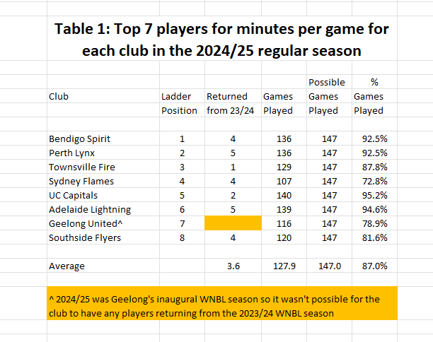 An important factor for a successful a basketball team is continuity both from season to season and throughout a season. Table 1 below looks at the level of continuity each of the eight clubs had with their top seven players for minutes played per game in 2024/25. The number of players used in rotations varied throughout the league. The top seven players were chosen for this purpose as seven players were the shortest core rotations used by Bendigo and Southside, reducing the impact of coaches deciding not to give court time for a player.