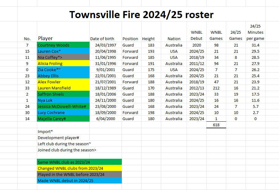 The Fire had a new look roster in 2024/25 and the only two returning players from 2023/24 that have averaged more than 10 minutes per game are guard duo Courtney Woods and Saffron Shiels. In the off-season Townsville recruited three players from rival WNBL clubs, Lauren Mansfield (Adelaide Lightning), Alicia Froling (Bendigo Spirit) and Alex Fowler (UC Capitals). On their main roster Townsville also had five players making their WNBL debut, American import duo Lauren Cox and Zia Cooke along with Australian trio Abbey Ellis, Nya Lok and Lucy Cochrane.