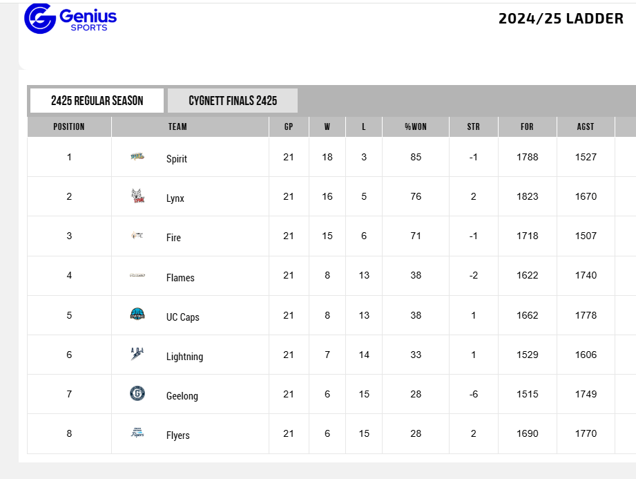 During the 2024/25 season there was considerable movement among the teams from fourth to eighth place on the ladder. Entering the penultimate round of the regular season, Round 15, four teams were in contention for fourth position – Sydney, Canberra, Adelaide and Geelong. In the final game of Round 15 Sydney defeated UC Capitals to secure the last place on the WNBL finals grid. At the end of the season Sydney and the Capitals had identical win-loss records of eight wins and 13 losses. For the second season in a row a tie-breaker was required to determine which of the two clubs finished fourth. Sydney won the 2024/25 tie-breaker due to defeating the Caps three games to nil in the Head to Head series between the two clubs. After having two wins and 10 losses at the end of 2024 the UC Capitals resurgence in 2025 fell one win short of making the finals. Adelaide Lightning finished in sixth position with seven wins and 14 losses. Geelong United and Southside Flyers both had a record of six wins and 15 losses. Geelong won the Head to Head series between the two Victorian clubs three games to nil to finish seventh. Reigning WNBL Champions the Southside Flyers finished last on the ladder.