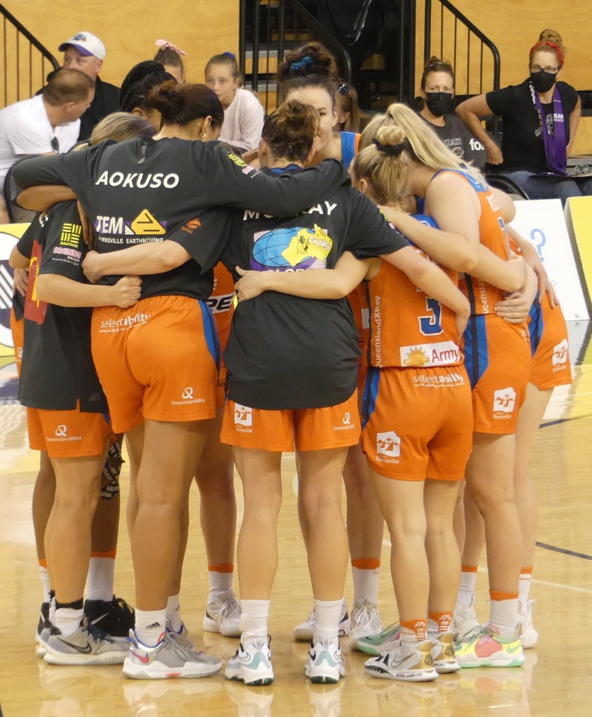 Courtney Woods in a huddle with Townsville Fire teammates during the game against the Southside Flyers at the State Basketball Centre on 4 January 2025