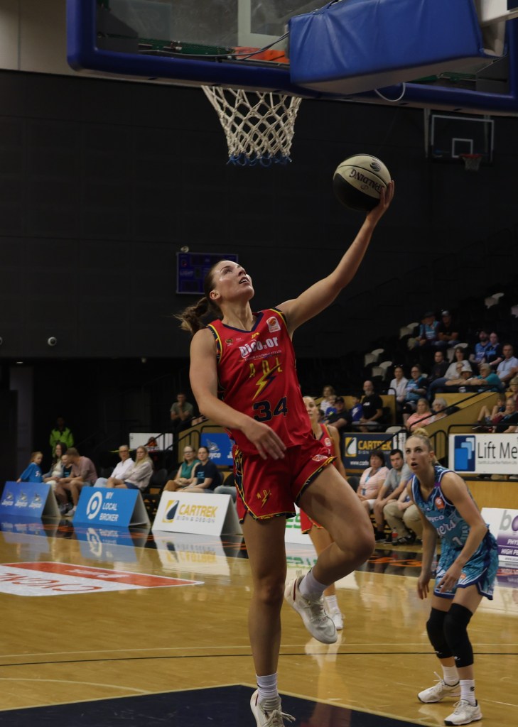 Isabelle Bourne making a lay up for Adelaide Lightning against Southside Flyers at the State Basketball Centre on 6 December 2024