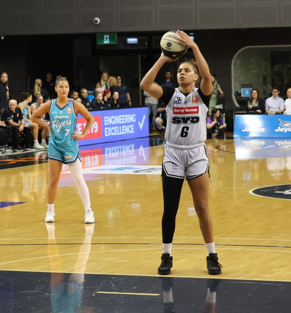 Shaneice Swain shooting a free throw in the Sydney Flames road game against Southside Flyers at the State Basketball Centre on 9 November 2024