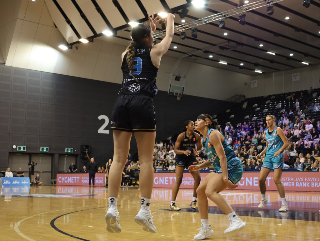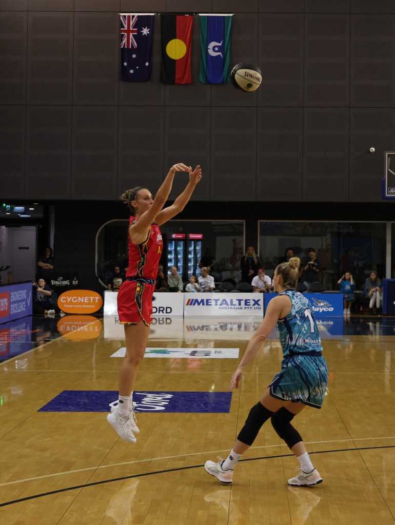 Steph Talbot shooting a three pointer for Adelaide against Southside Flyers at the State Basketball Centre on 6 December 2024