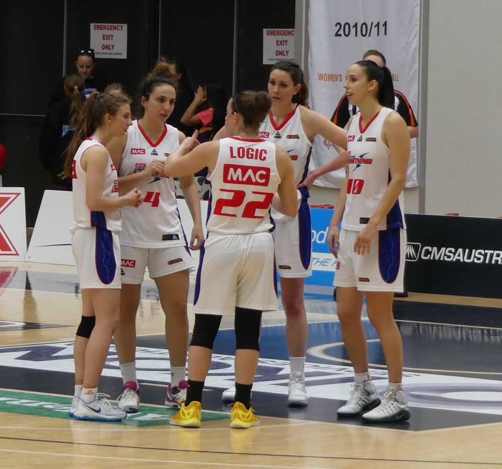 Adelaide Lightning team huddle during the game against the Melbourne Boomers on 9 October 2016 at the State Basketball Centre