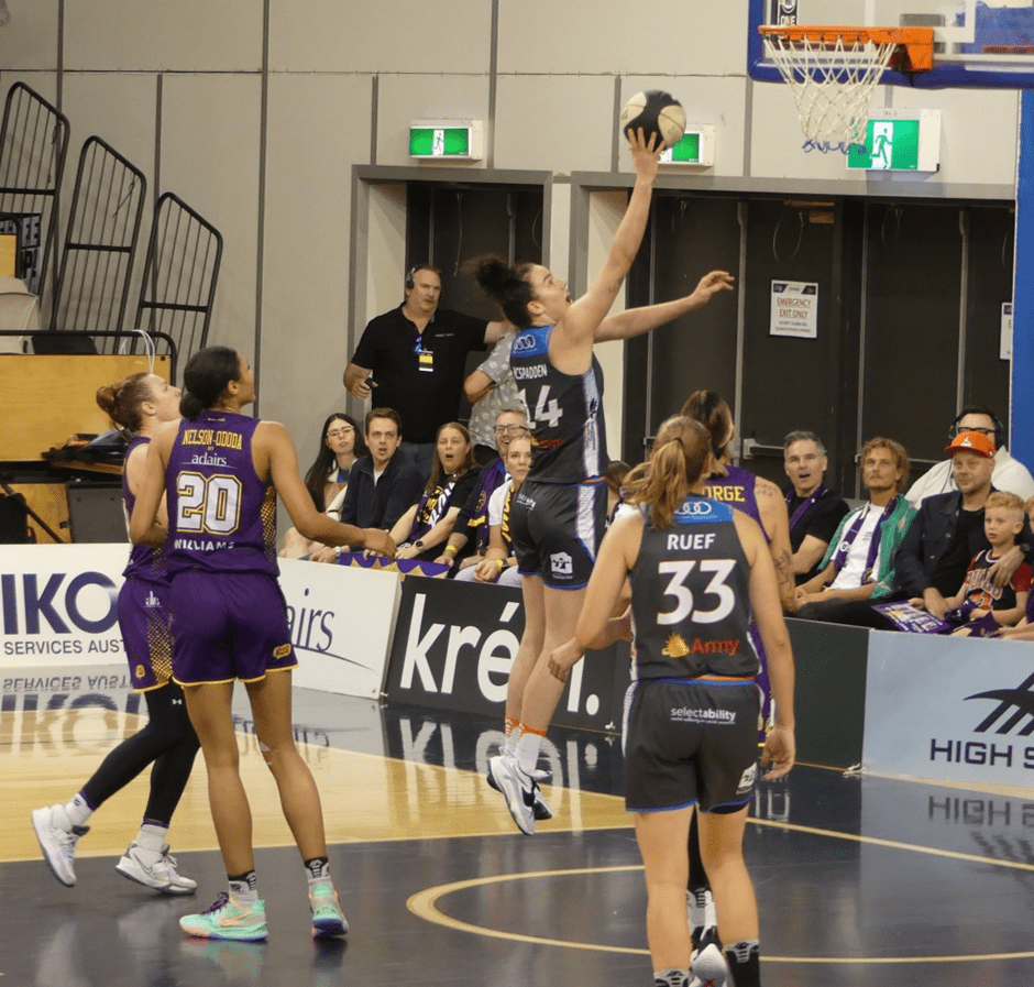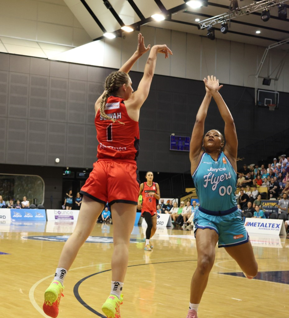Miela Sowah (nee Goodchild) shooting a three-pointer for Perth Lynx in their road game Southside Flyers at the State Basketball Centre on 1 December 2024