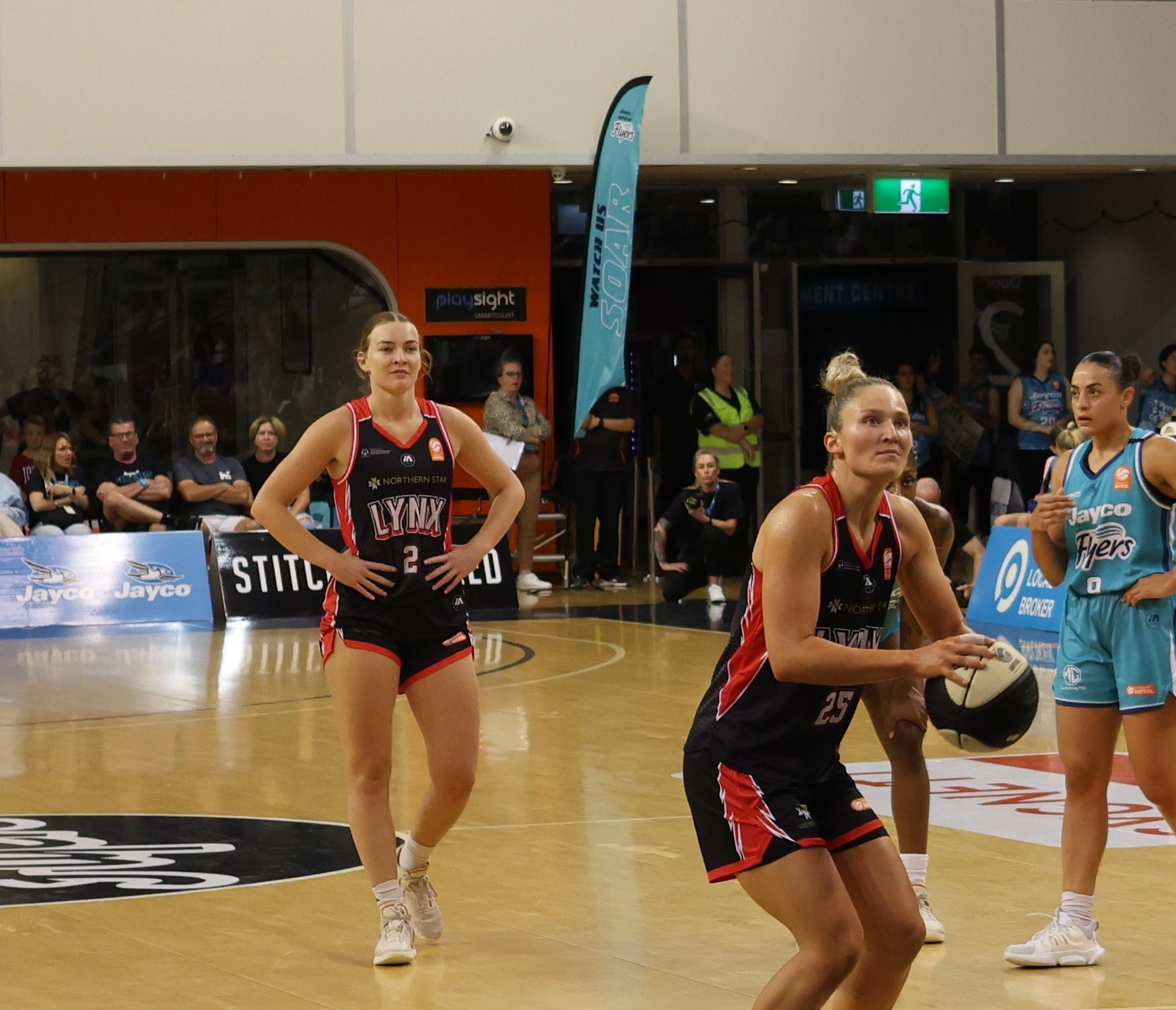 Lauren Mansfield and Marena Whittle playing for Adelaide Lightning against the Melbourne Boomers at the State Basketball Centre on 22 December 2022